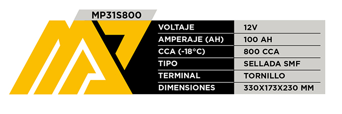 Bateria Mining Parts de 12 V 100 AH, 800 CCA de arranque en frio, equipada con borne tipo tornillo y polaridad Positivo Izquierdo. Disenada para ofrecer una maxima potencia, entregando un arranque confiable prolongando su vida util, manteniendo un alto rendimiento en las operaciones requeridas.